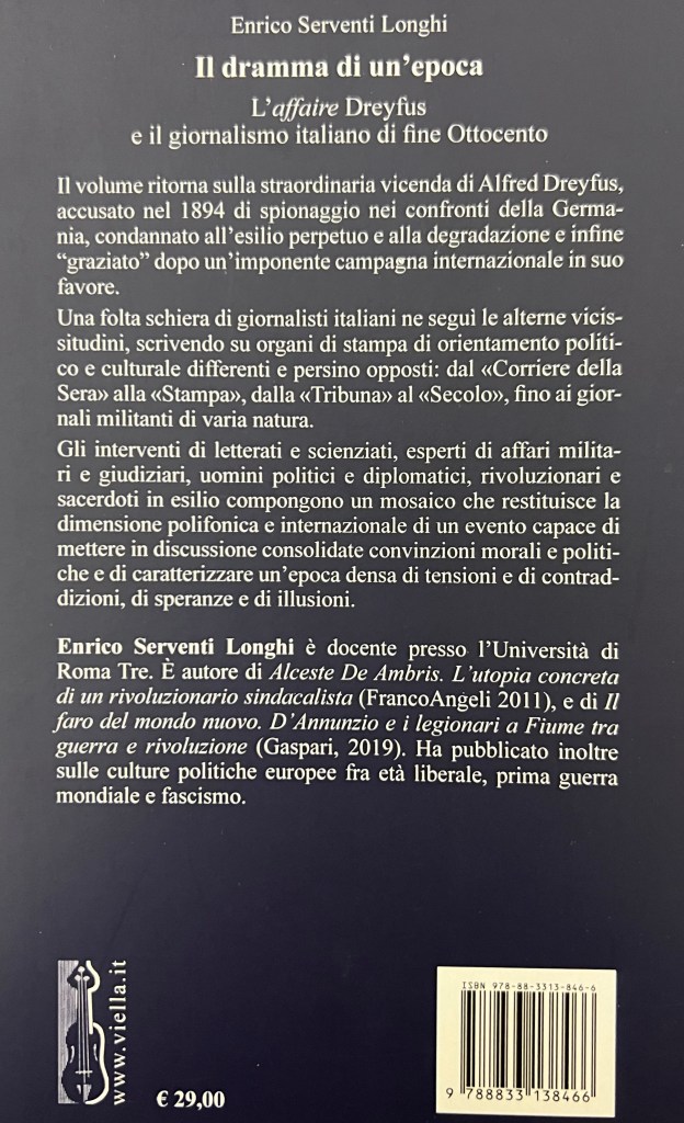 E’ entrato nella collezione del Pestelli il saggio Il dramma di un’epoca. L’affaire Dreyfuss e il giornalismo italiano di fine Ottocento (Viella, Roma, 29 euro). Scritto dal professor Enrico Serventi Longhi, docente all’Università di Roma Tre, narra la straordinaria vicenda di Alfred Dreyfus, accusato nel 1894 di spionaggio nei confronti della Germania, condannato all’esilio perpetuo e alla degradazione e infine “graziato” dopo un’imponente campagna internazionale in suo favore.
